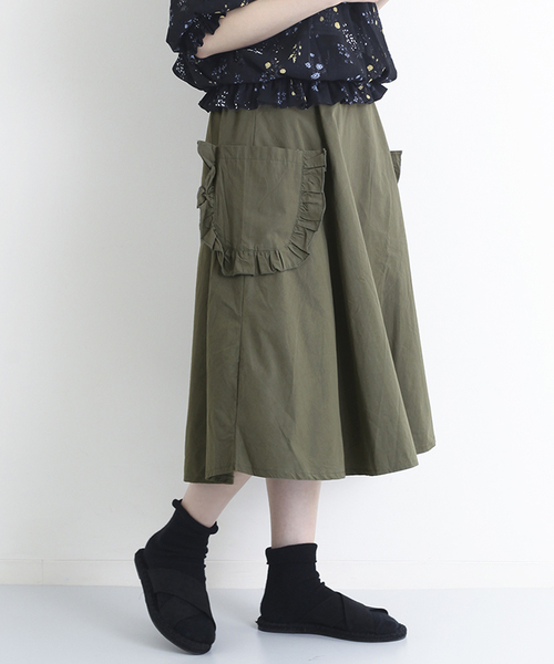 フリルポケットがついたミモレ丈スカート。ふわっと揺れるフレアが女性らしいです。 ヒールで合わせるのはもちろん、キャンバススニーカーなどとあわせて大人カジュアルなスタイリングもおすすめです。 裏地有りです。 ※染料の性質上、摩擦や汗などにより色落ちしたり他の物に色移りする場合が御座いますのでご注意下さい。