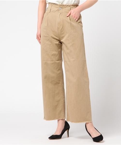【ハイウエストがスタイルアップの鍵】ウエスト部分と裾部分がきりっぱなしのラフな印象。ハイウエストになっているのでスタイルアップが期待できる1着。シンプルなトップスでもこなれ感ある着こなしに♪