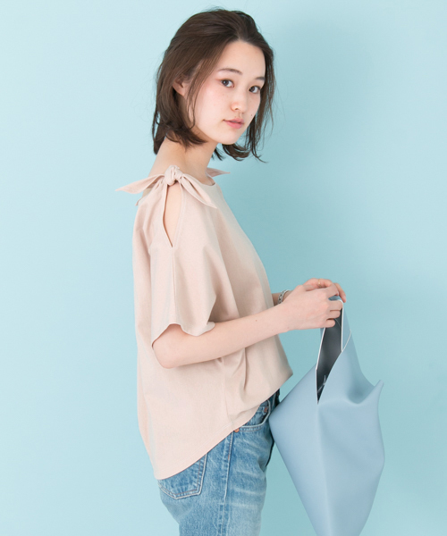 サイドからちらりとお肌がのぞき、品の良い肌見せが叶うプルオーバー。ショルダーに施されたリボンは小ぶりに仕上げ、子どもっぽさを回避。またハリのあるコットン素材が甘過ぎない印象を与えてくれ、デイリーに普段使いしやすい仕上がりに。着丈は長すぎないジャスト丈に設定しているので、ワイドパンツやフレアスカートなどともバランス良くキマります。 また前後で長さに変化をつけており、後ろは少し長めに仕上げた事でヒップを自然にカバー。着やせ効果も期待出来る1枚です。