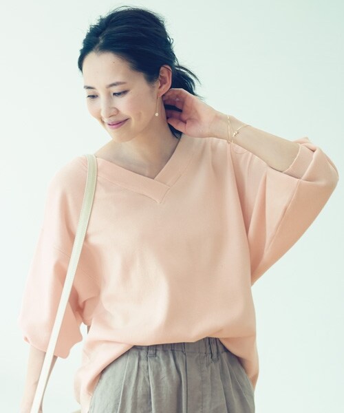 studio CLIP meets naoko hamajimaコットンベースの程良い厚み感のドルマンスリーブニットプルオーバー。衿元はVネック仕様、後ろ身は深めなタックが入っているので、お好みの抜け感を演出してくれます。気温に応じて袖を上げれば、袖まわりにフォルムが生まれる、今年らしいデザインに仕上げました。ゆったりとしたシルエットながら、裾にかけてはすっきりしているので、様々なボトムスとバランスよく着こなしていただけます。女性らしい優しいカラーリングもおすすめポイントです。