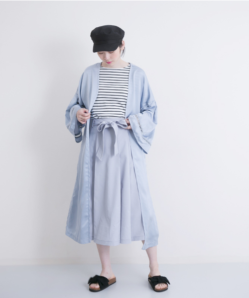 サテン調なのが春らしいガウン。ワイドパンツやアシンメトリースカートと合わせて羽織るだけでトレンド感溢れるコーデになります。