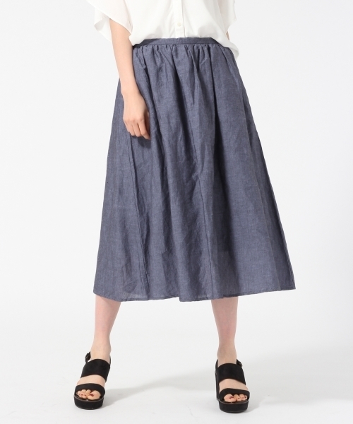 リネン素材で清涼感アップ! 麻混素材のさらっと涼しいスカートは季節感満載! ギャザーのはいったデザインでボリューム感はありつつも 広がりを抑えたシルエットによりスッキリとした印象になります。 ストライプ柄やグリーンカラーで華やかな着こなしが楽しめます。