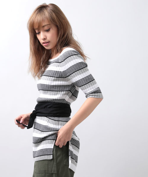 首元が大きくあいた五分丈ニット。長めの丈でレイヤードをお楽しみいただけます。一枚でもアクセントのある五分袖リブニット。柄でも無地でも使いやすく、重ね着もしやすいです。デイリーケアも簡単なボリューム控えめの薄手ニット。フォーマルでもカジュアルでも気分しだいでどちらにでもお使いいただけます。