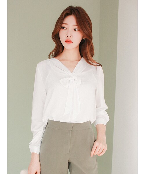 ネックラインのタイストラップ ポイントで首元から女性らしさを アピールしてくれるブラウスです。 ナチュラルにストラップを外して演出しても シックで洗練美高い雰囲気を! 肌に優しく触れる滑らかな質感が シーズンムード感じさせる一枚に。 ベストとビスチェとレイヤードしてもスタイリッシュに完成出来る、 グッドアイテムです。