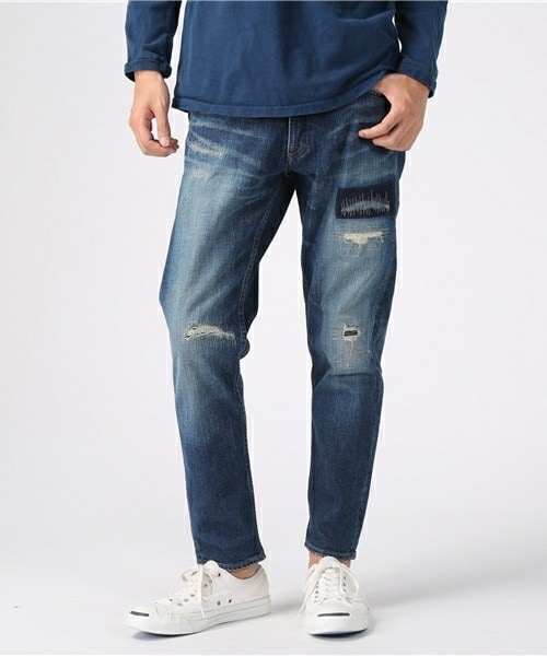 今国内外で話題の「JAPAN BLUE JEANS(ジャパンブルージーンズ)」との コラボジーンズです。 長い期間愛情を持って大切穿き込んだ雰囲気を、リペアや縦落ちで表現しました。 9分丈なので足元がスッキリと見えて、 スニーカーやスリッポンとの相性は抜群です。 【JAPAN BLUE JEANS とは】 2010年にデニムで有名な岡山県の児島でスタートしました。 綿から染色、織りまで全てにこだわった物作りを展開しています。 クォリティの高さがが国内外で認められ、 現在欧米のショップに数多くセレクトされています。 【この商品の特徴】 ・シルエットはメンズビギの完全別注 ・オシャレなバンダナが付いています。 ・忠実なリペア加工&ダメージ加工 ・後ろ右ポケットの上にスマホ専用ポケットを装備 ・生産・縫製・加工のすべて岡山県児島製 ・裾のチェーンステッチはブルーの糸を使用 ・穿きやすさを追求したウォッシュ加工&ストレッチ素材 ・脚がスッキリときれいに見えるスリムテーパードタイプ