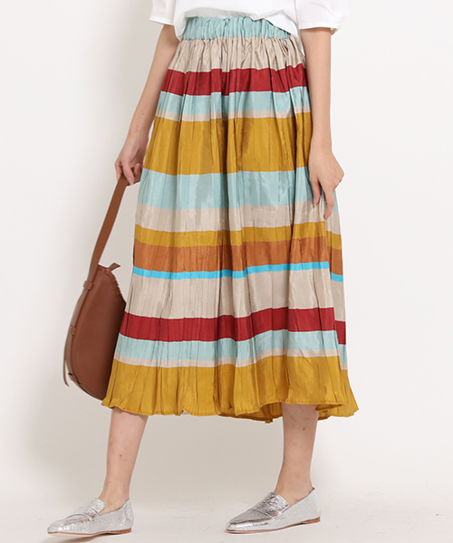 イタリアの素材メーカー「BONOTTO」社の素材を使用したボーダーロングスカート。絶妙なプリーツに日本ではなかなか出せない配色使いは、さすがと言わざるを得ない逸品です。トレンドの膝下丈感のスカートは、1枚で主役級になれるアイテムです。 ぺチコート付き(ペチコートは本体から取り外し可能です。)