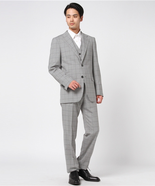 細身ながらも程よいゆとりをもたせたシルエットの3ピーススーツ。トレンドの「ラスティック」イメージの生地を使用しています。ラスティックとは表面に杢感・粗野感があり、カラーにおいては若干褪せたような色合いが特徴でナチュラルなイメージで着こなせます。格子柄がベースの色味に馴染んでいるので派手になりすぎないのもポイントです。 【おすすめシーン】 結婚式 二次会 フォーマル 式 通勤 パーティ
