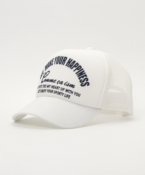 フロント部分にメッセージプリントを入れたメッシュキャップです。 後ろにはサイズ調節できるように、アジャスター付きになっています。