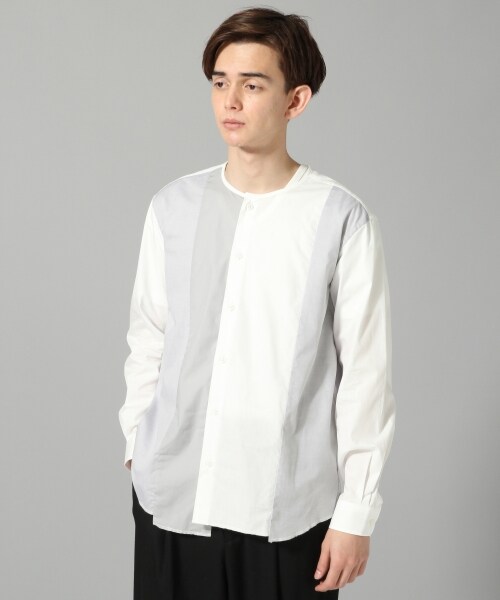 MADE IN JAPAN縦のラインで切り替えたデザインシャツ。配色カラーだけでなく、素材感もブロード生地とオックス生地を切替えています。配色のラインと裾部分が段差に仕上げたディティールはワンランク上のシャツスタイルを演出。すっきりとしたノーカラータイプなので、レザーやブルゾンなどとのレイヤードにも相性抜群です。今年らしくワイドパンツと合わたり、スキニーでキレイめスタイルに活躍する一枚です。