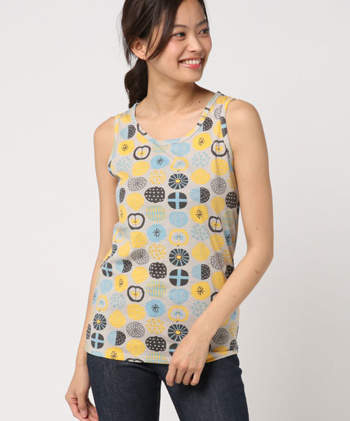 ポップでキャッチーなドット柄をフルーツの切り口で個性的に表現したオリジナルのデザイン。北欧雑貨のような手描きタッチのモチーフが存在感抜群なので、春夏の重ね着を賑やかに彩ってくれます。あらかじめ洗いをかけているので、はじめて着たときから肌になじむような優しい着心地に仕上がっています。トレンドのデニムコーデに映える賑やかなデザインは、メインでいっぱい使いたい♪総柄なので透け感もあまり気にせず取り入れられます。ほどよい開きのアームホールは、隙間から下着が見える心配もありません。背中を包み込んでくれるタンクトップのデザイン。お尻にかかるくらいのちゅうどいい着丈だから安心感も◎