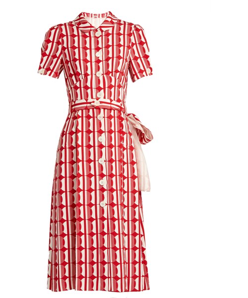 This red and white abstract-print crepe dress is a standout piece from Miu Miu's SS17 runway. The polka-dot and stripe print is inspired by the optimism of post-war Italy while the silhouette - complete with pleats under the bust a generous waist tie and slanted side pockets - is lifted from Miuccia Prada's own wardrobe. Add a sharp coat and flatforms for offbeat glamour.