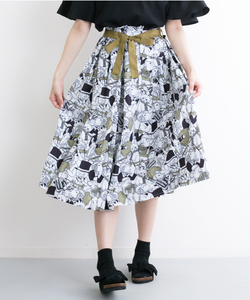 アニマル音楽隊の柄のミモレ丈スカート。ウエスト部分にはリボンがついておりブラウスなどに合わせるととても可愛いです。