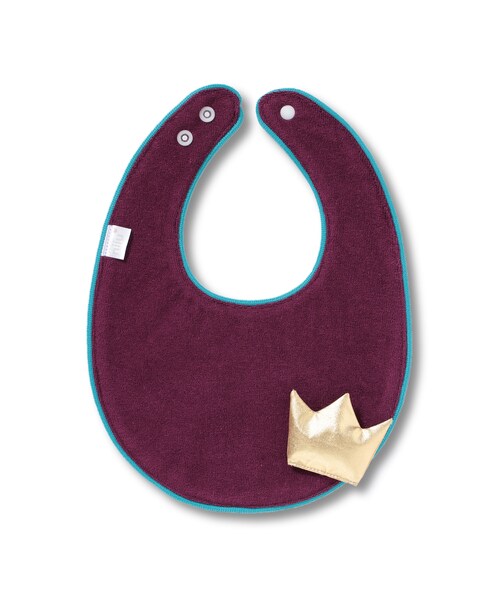 【商品の概要】 ポップな色使いと着用時のコロンとした丸い形がcute!金色のぷっくりした王冠もインパクト大で、まさに主役級のスタイです。裏地も太めのストライプ柄で、抜かりなくオシャレ! かぼちゃパンツとの相性は抜群、シンプルなスウェットパンツに合わせても◎。 ◆おすすめポイント 濃いパープルをターコイズのような独特のグリーンで縁取った、新感覚の配色は注目間違いなし。金色の王冠が際立つ色使いなので、王子様や貴族調のコーディネートにもバッチリ映えます。 ◆特長・メリット 形や色がかわいいだけじゃなく、機能性も高いスタイです。 表地にはパイル地、裏地には厚めのストライプ生地、さらにその間には特殊な防水布を挟んでいます。この防水布は、ヨダレをぐんぐん吸収して裏に通さないようにブロックした上で、溜め込んだ湿気をどんどんスタイの外に発散させるので、洋服も守れて、赤ちゃんも快適! サイズ感も、ヨダレもしっかりキャッチする幅を守りつつ、大きくなりすぎないように仕上げました。 ヨダレの多い赤ちゃんでも安心して使えるしっかりしたスタイです。 ◆商品スペック 推奨年齢:生後〜2歳くらいまで 素材: -表地:綿76%/ポリエステル24% -中地:ポリエステル100% -裏地:綿70%/ポリエステル30% ※洗濯時は、付属の王冠モチーフはネット使用or手洗いを推奨しております。 首まわり:約26〜28cm 首下の長さ:約12cm 横の最大幅:約19cm ※寸法は、商品により多少の誤差が生じる場合があります。