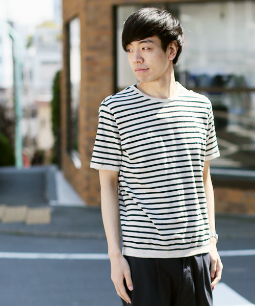 「ナチュラルな風合いのボーダーカットソー」 サラリとした肌触りが清涼感あるボーダーカットソーです。 綿の持つ柔らかさと麻のナチュラルな表情を併せ持った、 quadroオリジナルの素材を使用しています。 杢のかかった色味なので様々なコーディネートに合わせやすく、 メインとしても羽織りのインナーとしても重宝する一枚です。 「素材」 杢調の色合いの硬い糸質のラミーと、 細い綿糸を撚ることで、表面にシャリ感を生み出す quadroオリジナルの糸を使用。 柔らかな表情に程よい光沢が爽やかな風合いです。