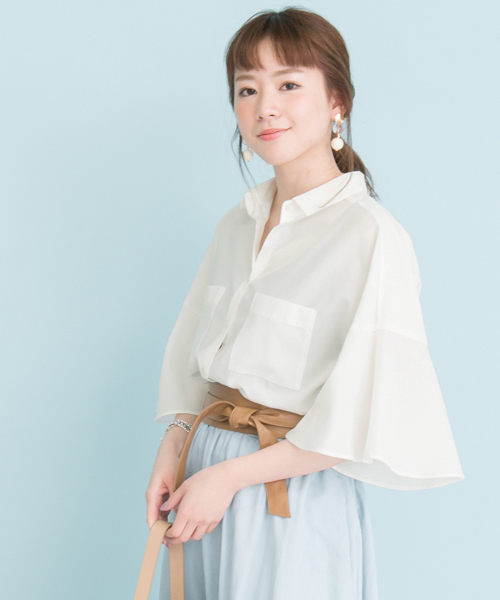 このアイテムはWEB限定商品です。 空気を含んだようなライトな生地感がお袖のフレアスリーブを甘過ぎない大人の雰囲気に格上げして魅せてくれるシャツブラウス。 シャツ×フレアスリーブというありそうでなかった新鮮な組み合わせが気どり過ぎない大人のこなれ感を演出してくれます。 バックスタイルにほどこされたタックで、全方位どこから見てもおしゃれに魅せてくれます。 ボタンを大きめに開けてラフに着崩せば、簡単に今年らしい着こなしに。 デニムとラフに合わせたり、マキシスカートやワイドパンツと合わせてエフォートレスな雰囲気に仕上げても◎ 二の腕が隠れる袖丈も嬉しいポイントです。 ※透け感あり※この商品(BEIGE)は、素材の特性上、直射日光や蛍光灯に長時間に当たると変色や色褪せすることがありますので、ご注意ください。