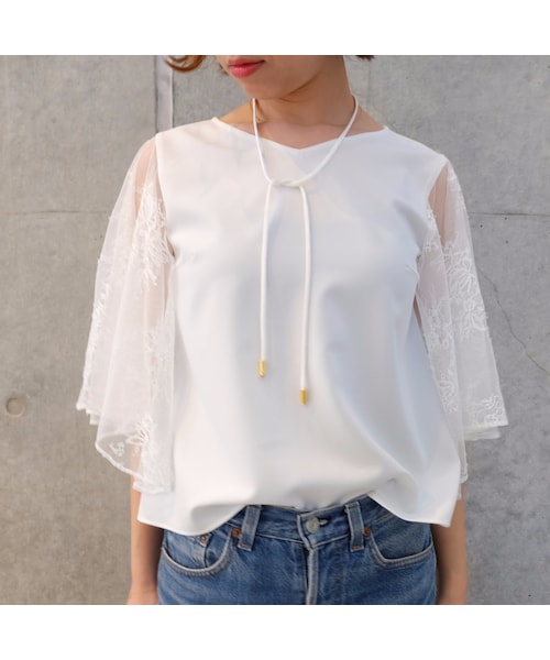 繊細なレースとボリューム袖が目を引く綺麗めブラウス。 ネック部分に付いている紐は前後どちらに付けてもOKな2way仕様かつ、首元にしっかり巻きつけるとチョーカーデザインにもなる優れもの! 「二重織りウエストゴムパンツ(008142)」と同素材です。
