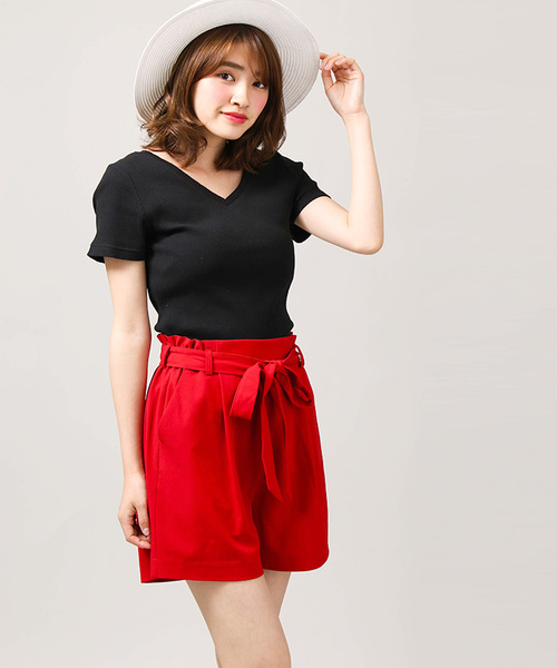 ウエストリボンがアクセントになるショートパンツ。人気のハイウエスト仕様で、トップスをインした際にウエスト周りのシルエットが綺麗に見えるひと品です。バックウエストはゴム仕様なので、リラックスして快適に着用頂けます。どのテイストにも合わせやすいベーシックなデザインのショートパンツは、一枚あると重宝するアイテム。流行に左右されることなく長くご愛用頂けるのと、リーズナブルなお値段も魅力の一つです。今季はベレー帽やスニーカーなど、小物で遊びを効かせるような着こなしもオススメです。ショートパンツ / ショーパン