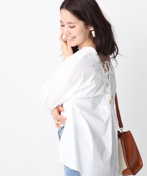 Aラインシルエットのブラウスです。後ろがレースアップになっていて、抜け感のあるブラウスです。少し長めの丈感でインでもアウトでも決まります。