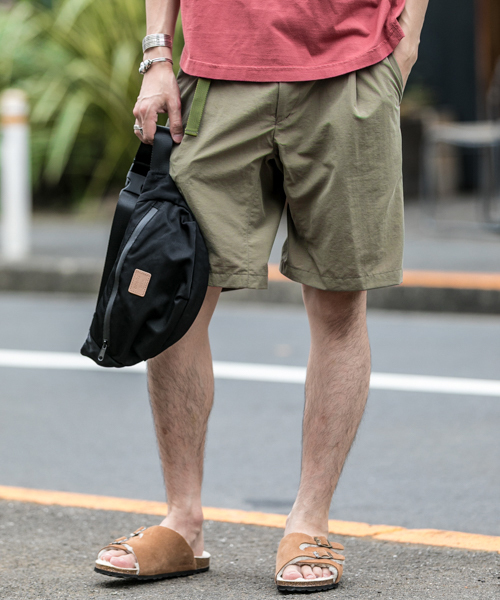 【隠しバックポケット付きのイージーパンツ】斜めにカットした切り替えデザインのバックシルエットがユニークなイージーショートパンツ。前腿上部分にはタックを入れ、動きやすさも格別です。背面の切り替え部分にはファスナー付きポケットが隠れており手軽に出かけたい日にマストな1着。POINT・動きやすいややワイド目な裾幅・表面が美起毛しているピーチナイロン素材COORDINATE夏はそのままTシャツでイージーに、秋は同素材のジャケットコート(19609435(ZOZO)UW74-17U020(店舗))と合わせカジュアルなセットアップスタイルもオススメです。WORK NOT WORK / ワーク・ノット・ワーク“People's Tailoring, Freedom Culture.”クリエイティブで自由な精神を持ち合わせた人々のためのものづくりWORK NOT WORK は〈フリーダムカルチャー〉をコンセプトとした日本のブランドです。ロンドンをベースにデザイン・クリエイティブ業界で活躍を続けるTOMATO のファウンダーの一人であるSimon Taylor(サイモン・テイラー)がクリエイティブディレクターに就き、民族性、音楽、年、自然、テクノロジー、製造文化、アナログ、ポストアナログ、カウンターカルチャーなど、世界中の多種多様なものから影響を受け、ものづくりのインスピレーションとしています。