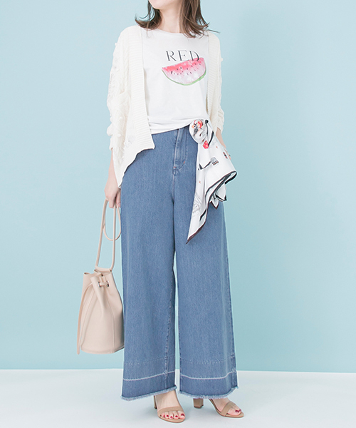TRILL掲載商品 裾をフリンジ風にカットオフで仕上げた今年らしいワイドパンツ。 脚のラインがでないゆったりシルエットながら縦に落ちるストレートデザインでもたつかずすっきりとした印象に。 またハイウエストのお作りで脚長効果バツグン。 簡単にスタイルアップが図れる優秀なパンツです! ハリ感をおさえた柔らかなお素材が、カジュアルな印象のデニムをリュクスに昇華。 トップスがシンプルでも1枚で大人のこなれ感を叶えてくれます。※この商品は、特殊な加工をしているため、色合いや風合いが1点1点多少異なります。予めご了承ください。 ※この商品は、インディゴ染めです。染色の特性上、着用中の摩擦や汗により、色落ちや色移りする可能性がありますので、ご注意ください。 また、日光や照明などに長時間当たると変退色する可能性がありますので、ご注意ください。 ※その他お取り扱いに関しましては、商品に付属のアテンションタグをご確認の上、充分ご注意ください。