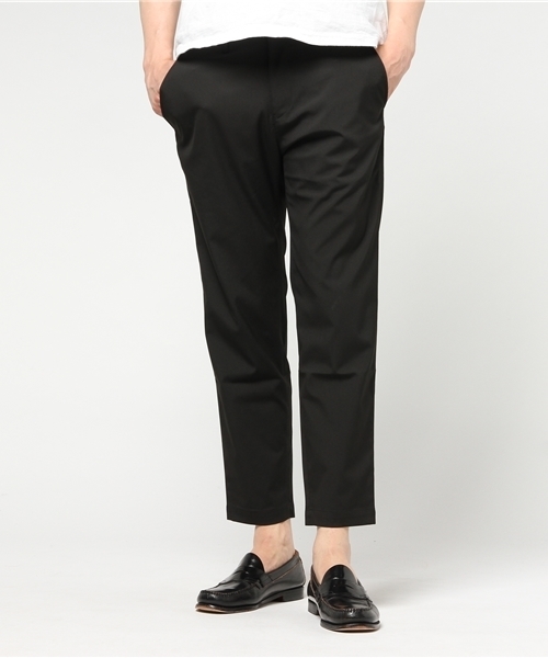 【イージーデザインのMA-1とセットアップで着用できるアンクルトラウザーズ】 <デザイン> 通気性や軽さが特徴のトロピカル素材を使用したイージーデザインのトラウザーズです。シルエットは裾にかけてテーパードさせた細身のライン。 ウエストゴム仕様でレングスは足首をすっきり見せるトレンド感のあるアンクル丈です。 ポケット袋布にはアイコニックなクレストブリッジチェックを使用しています。 キレイめなスタイルにも合わせることのできる汎用性の高い1着です。 ※同素材のMA-1とセットアップでお楽しみいただけます。 ※トロピカル・・・主として夏服用の薄地の織物 <素材> 細番手の糸を使用した上品な光沢のあるトロピカル素材を使用しています。 ウールの梳毛のようななめらかな質感と、優れたストレッチ性により履き心地抜群の素材です。 ※クレストブリッジチェック・・・シンプルでありながら強い印象を残す、 ブリティッシュスタイルを軸とするBLACK LABEL CRESTBRIDGEのシンボルパターン