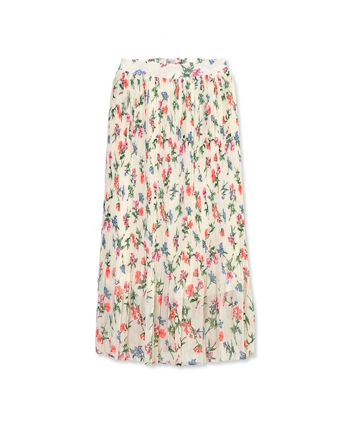 透け感のある生地に細かくプリーツを入れることで、大きな柄でも挑戦しやすいアイテムに仕上げました。 ひざ下から消えるプリーツがゆらゆらとしたフレアをつくり、プリーツとフレア両方の表情を楽しめるのもポイント! プリーツスカートに飽きてしまった方にもオススメしたいスカートです。 軽やかな雰囲気のWHTと、古着のようなBLKの2色展開です。 程よい丈感の裏地で透け感もあるので、BLKも涼しげに着ていただけます! トップスには無地のTsやサーマルなどを合わせてさらっとした着こなしはもちろん、レース系と合わせた上品なコーディネートもオススメです。