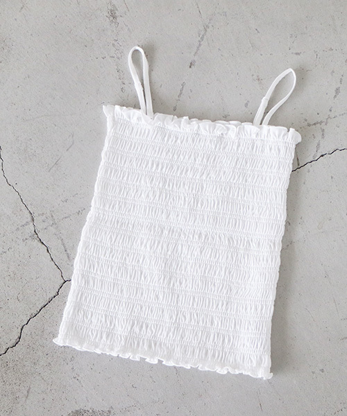ボディにフィットしてスッキリ着こなせるシャーリングレースキャミソール!女性らしいアクセントになるシャーリングに、ヘルシーな胸元を見せるベア型です。トレンドのワイドパンツやデニムと合わせ、カーディガンを羽織ったり、Tシャツ感覚で取り入れると簡単です。※肩ヒモ調節可