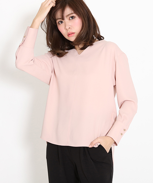 生地を2枚重ねにしたふんわりした厚みのあるブラウス。前は程よいVネック、後ろは少し抜け感を出したデザインになっています。シャツのような袖のデザインも今年のトレンドです。前後差のあるデザインは、前はインして着ていただくのがおすすめのスタイリングです。