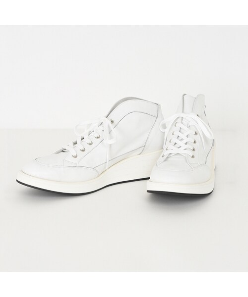 きめ細かな表面と柔らかな肌触りのあるベビーカーフを使用したハイカットスニーカー。 ソールはスポンジ構造のため軽量でクッション性に優れ、 インソールには低反発のウレタンを使用し 足の負担を軽減した疲れにくいスニーカーです。 トゥスプリングが高いのでより軽さを感じやすく、 踵のストレスが少ないため腰裏革の磨耗が少なくなります。 ソールの厚さはつま先 2cm、ヒール 5cmです。