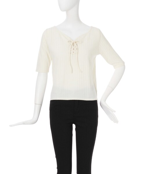 編み上げられたレースアップデザインがフェミニンなアクセントになったトップス。ストレッチが効いたリブ素材で着心地もバツグンです。程よくボディに沿ったシルエットが女性らしさを演出してくれます。