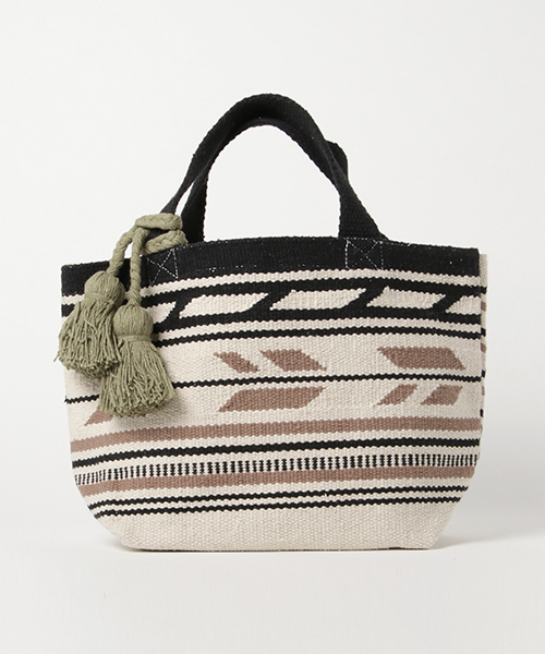 メキシカンラグを思わせるエスニックなパターンが人気となっている「Lilas Campbell(リラキャンベル)」のトートバッグ。 裏と表で柄が異なるので、気分によって持つ側をアレンジすることもできます。 エスニック気分を盛り上げるタッセルは、大きめボリュームが可愛さのカギ♪ 普段使いにはもちろん、リゾートワンピに合わせた夏のお出かけシーンにもおすすめです。