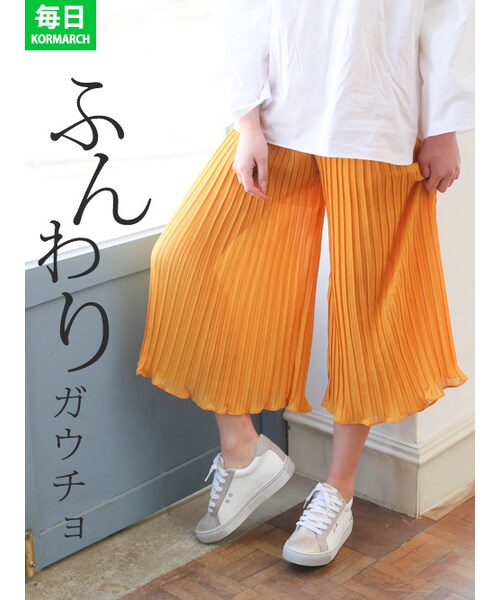 ウエストゴムで楽ちんなのにオシャレに見えるシフォンスカンツ。 プリーツデザインがトレンド感をプラス! 足首も見える丈感ですっきり見せてくれます。 おしゃれ心が詰まった今季トレンドのプリーツシフォンスカンツ。 さらりと揺れる細プリーツが上品な印象に。 Tシャツと合わせてカジュアルコーデに着るのもオススメ! ワイドなシルエットが相まって、フレアスカートの様なシルエットなので、 トップスはコンパクトにまとめると好バランス。 ゆったりと楽に穿けるのに、ひらっとフェミニンに魅せてくれるのが嬉しい一本です ほんのりナチュラルなアクセントを添えました。