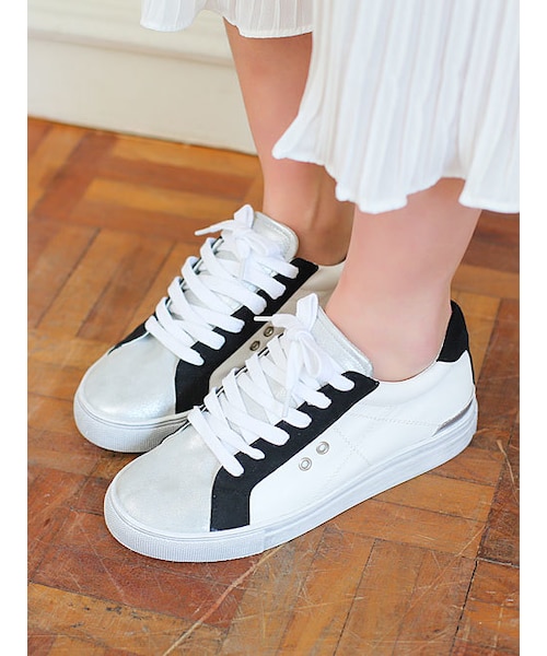 わざと汚した感じがヴィンテージライクで ユニークな印象のスニーカーです。 レザー調質感とスウェードライクの素材ポイントが可愛い! 薄いパールポイントをうまくMIXさせて カジュアルながらも洗練された一足です! カジュアルなスニーカーなので デニムやワイドパンツなどラフな スタイルによくマッチします。