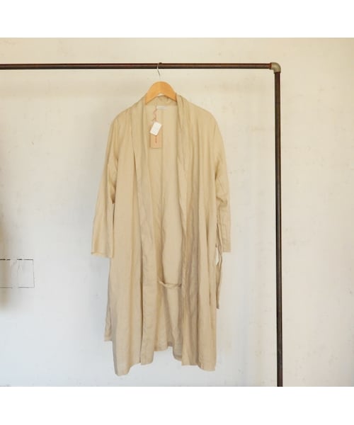 へちま衿のローブコート。肌をきれいにみせてくれる春らしいパステルトーンで、薄手の生地を使ってある分、丈を長めにしてあります。ベルトはキュッと前で締めても、後ろでゆったり結んでも様になります。冬の寒さが少し残る春先から汗ばむ陽気の初夏まで、気候に合わせて着て頂けたらと思います。ヨーロッパの古着のワーク物にありそうな雰囲気があるのも良いです。