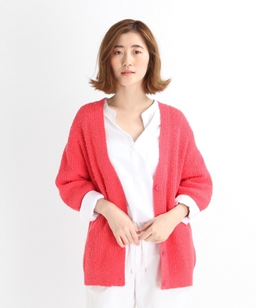 表情のある糸が魅力のカーディガンです。ざっくりとしたシルエットで少しゆるく着て頂けるので、トレンドのボリューム袖のブラウスやドルマンのプルーオーバーとも相性抜群。 前立てはヒヨク仕立てで、すっきりとした印象で着て頂けます。 特にピンクは発色の良い色合いで羽織るだけで今年らしい表情になるアイテムです。