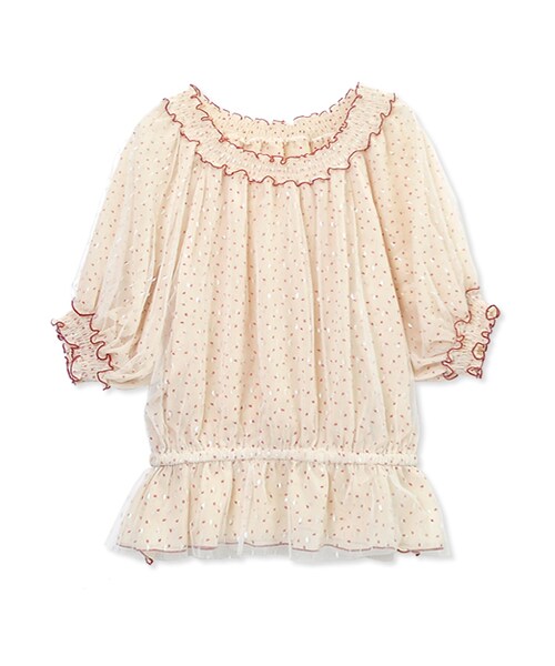 細かいドットのような不思議な柄の上に、キラッと光るふんわり可愛らしいチュール素材を重ねることで、やわらかな風をふんだんに吸い込むような軽やかで華やかな春のとっておきの一枚に仕上げました! 可愛いデザインブラウスですが、可愛くなり過ぎず大人っぽい、絶妙なカラーとラメ感のバランスがポイントです。 首元は、シャーリングのゴム仕様でオフショルとしても2wayで着れます。袖もゴム仕様でぽわんと膨らむボリュームのある袖が可愛さだけでなく、さりげなく腕をほっそり見せてくれます。 デニムやスカートで、さらっと好バランスに着こなしたい一着。
