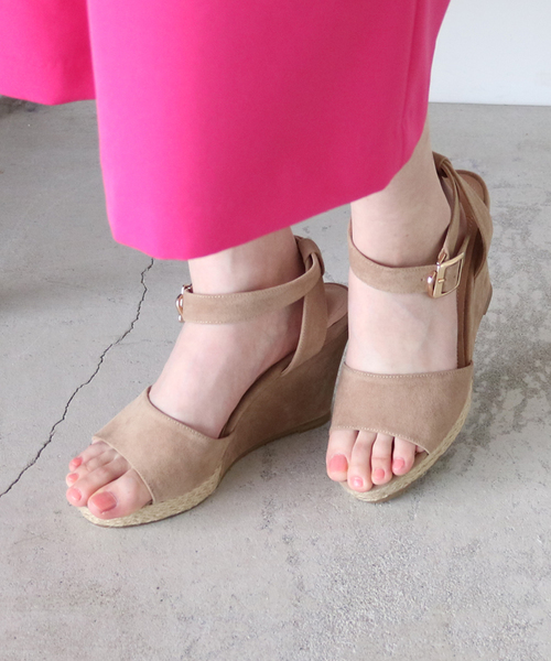 足元に重厚感を出せるベーシックウェッジサンダル!脚長を狙えるウェッジソールに、甲のバンドやアンクルで引き締め女性らしさを演出。つま先部分のソールは縄編みなので、さりげないヌケ感もあり、春夏styleに馴染む1足です。