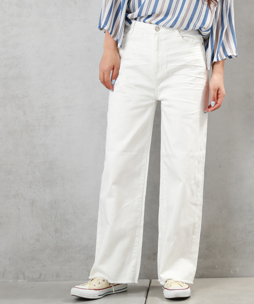 ✔ ハイウエストのデニムワイドパンツカットオフのデザインで、裾のフリンジがポイント。大きく見えるワイドパンツもウエスト~ヒップをスッキリさせたラインに見せるデザインが、着太りを防ぎ、着こなしやすくしてくれます。ブラウス×サッシュベルトのトレンドコーデにも、シンプルにtシャツやニットで着こなしても◎。