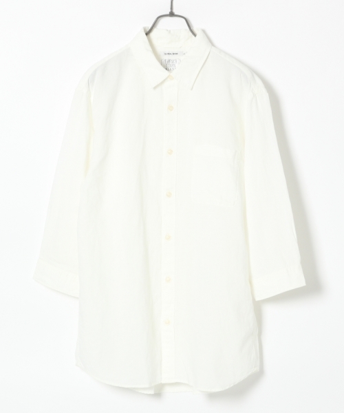 ☆高品質なフレンチリネン使用☆上質なフランス産のリネンを使用したリネンコットン混合素材のシャツ。適度なハリ感がありながら肌触りが柔らかく、着心地も抜群。表面の風合いもとてもよいです。汗をかいてもべたつきにくく乾くのも速いので暑い時期にも快適に着られます。ボタンをしめてカッチリ着るのも良し、前を開けて羽織るも良し、袖を少しまくってラフにまとめるのも良し様々な着こなしが楽しめるのでワードローブのひとつにおすすめです。