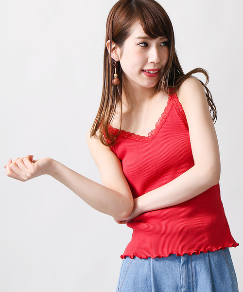 随所にレースデザインを施したタンクトップ。伸縮性のあるリブ素材で、一枚でもインナーとしても使いまわせる万能アイテム。 前後どちらでも着用できる2WAY仕様となっており、VネックとUネックの2通りのスタイリングをお楽しみ頂けるひと品。ゆったりとしたカットソーやニットとのレイヤードコーディネートにもぴったりです。 お値段もお手頃ですので、色違いでの購入もオススメです。