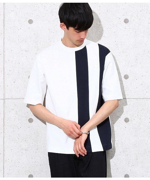 前面に施されたライン柄がアクセントになるTシャツ。 素材は肉感のある綺麗なポンチ素材を使用し、夏の季節に一枚でさらっと着易い仕様。 デザインもタイト過ぎず万能に使いやすいシルエット。 綺麗な素材感ですが、カジュアルにタイトなデニムからスラックスなどのパンツにも幅広く合わせていただけます。
