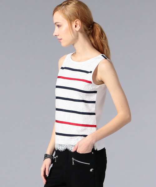 美しいレース生地にグログランテープを丁寧にたたき付けてボーダーにした、手の込んだ贅沢な逸品。繊細なデザインに見えますが、レースの下にはカットソー素材が付き、毎日のコーディネートをワンランクアップできる、華やかさと実用性を兼ねそろえています。 春はジャケットのインナーに、夏はショートパンツとあわせるなどオールシーズン愛用できる一着です。