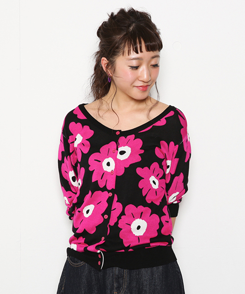 大ぶりのフラワー柄を編み込んだポップなデザインのニットカーディガン。さらっとデニムを合わせたシンプルなコーディネートも、華やかに決まります。肩に巻いたスタイリングもおすすめ。