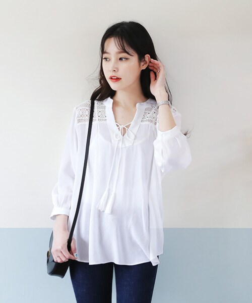清楚なムード漂わせるホワイトブラウス!ショルダーのレース部分から透かす肌が女性らしいさをぐんっと高めてくれる♡Vネックにはタッセルストラップを施しトレンディに仕上げました♪ ※WEARに記載してある金額と、DHOLIC通販サイトに記載してある金額にシステム都合上、稀に誤差が生じます。正しい金額はDHOLIC通販サイトに記載された金額です。