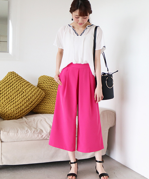 キレイめ生地で仕立てたタックガウチョパンツ!タック入りでどこかリラックス感のあるシルエットは、脱マンネリを狙える色の力を味方に。サイドファスナーやウエスト後ろギャザーで大人見えのするディティールも取り入れています。ヌキ襟やシンプルTシャツやニットまで、合わせるアイテム次第で着こなしの幅が広がる1本です。※裏地付き