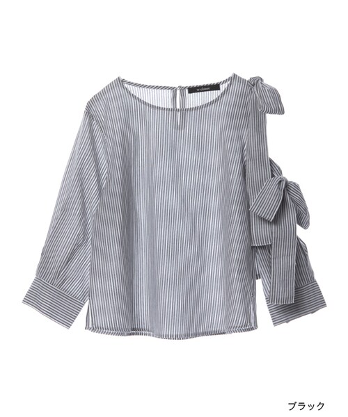 【SPRiNG 4月号掲載】【FUDGE 4月号掲載】【non-no 5月号掲載】【SPRiNG 5月号掲載】肩周りに大きなリボンがあしらわれた袖コンシャスなブラウス。この春は肩や袖にデザインがほどこされたアイテムがトレンドです。左肩からちらりとのぞく程よい肌見せ感が女性らしさをグッと上げてくれて◎。爽やかなストライプ柄なので、シンプルなボトムスに合わせるだけで一気に春らしいコーデが完成します。フェミニンなアイテムですがワイドパンツやボリュームスカートなどあわせると程よくカジュアルでおしゃれです。