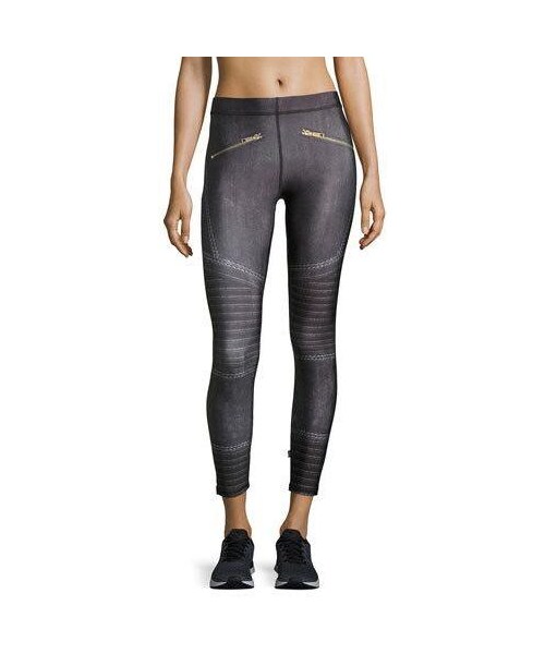 Terez moto-style performance leggings in leather print with contrast channel stitching. Moisture-wicking, breathable athletic fabric. Angled front zip pockets. High rise. Second-skin fit. Pull-on style. Polyester/spandex. Machine wash. Made in USA.