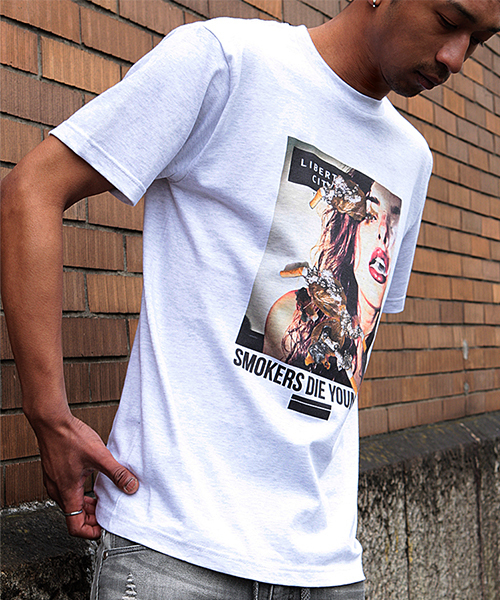 【シニカルなグラフィックが効いたメッセージTシャツ】[SMOKING DIE YOUNGER = 喫煙者は早死する]タバコのパッケージに印刷されている警告文を、インパクト大なガールフォトで表現したメッセージTシャツです。従来のべたつきのある固いプリントではなく、柔らかさと鮮やかさを両立させたインクジェットプリント手法も魅力の1枚です。【ベーシックでありながら厳選された素材とシルエット】着心地や素材感にこだわった5.6オンスの天竺生地は、よれない・透けない・長持ちするというTシャツの3大要素をすべて兼ね備えています。フィット感のある首回りは頑丈なダブルステッチを、脇は縫い目のない丸胴仕様をそれぞれ採用しており、ハイクオリティーな1枚に仕上がっています。また、肩幅や着丈にゆとりをもたせたサイズ感は、1枚で着ても様になるシルエットです。オーセンティックなスタイルなので、女性にもオススメです。【着こなし次第で様々なスタイリングに】ジャストサイズでカジュアルなスタイルに、また大きめのサイズをチョイスしてビッグシルエットなストリート感あふれるスタイリングに。魅力的なグラフィックを生かした1枚での着用はもちろん、ジャケットやコート、パーカーなどのインナーとしてもスパイスの効いたコーディネイトに仕上がります。デニムパンツやスウェットパンツ、ジョガーパンツなどと合わせたラフでカジュアルなスタイルやワイドパンツと合わせたリラックスなスタイルなど、コーディネイト次第で様々な表情を見せる1枚です。カラーはホワイトとライトグレーの2色展開です。【LIBERTY CITY/リバティーシティ】LIBERTY CITY [リバティーシティ]は、仕事の充実感を知り、身体を動かす休日の心地よさを知る、アグレッシブな大人達のためのライフスタイルブランドです。“BORN IN TOKYO”という名のもと、スポーティでスタイリッシュ、コンファタブルなのにエッジィな、TOKYO発の「アーバンリアルスタイル」を提唱していきます。LIBERTY CITYのものづくりは、様々なブランドを生産してきたアパレルメーカーとしてのノウハウを活かしたプロダクトです。そのアイテムたちは、日本を始めそれぞれの特性に合った各国のパートナーファクトリーに生産を依頼することで、[ハイクオリティー/フェアプライス]を実現させています。※モニター・環境等により実際の商品と多少色味が異なって表示される場合がございます。あらかじめご了承ください。■お買いものをよりお楽しみいただくには◆商品のお気に入り登録完売カラーの再入荷通知、残り1点の通知、セール等値下げした時の通知も受け取ることができます。◆ブランドのお気に入り登録新商品や再入荷など、いち早くブランドのお得な情報を受け取ることができます。是非ご活用ください。