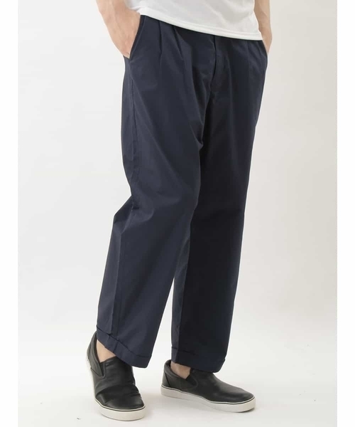 薄手のコットンが肌触りの良いツータックパンツです。特徴的なベルトがポイントになったお洒落なイージーパンツは、着心地とデザインの両方を兼ね備えた嬉しいアイテムです。 model:H182 C92 W71 H90 着用サイズ:48