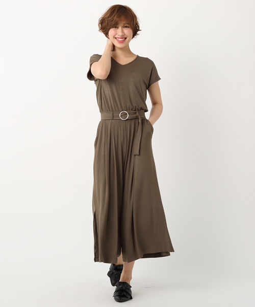 手触り・着心地抜群!1枚でさらりと着れるロンパース。シンプルなデザインの中に、歩くたびに揺れるサイドスリットから脚が覗きます。 リング付きの共布ベルトでウエストをマークすることでスタイルよく着こなせます。